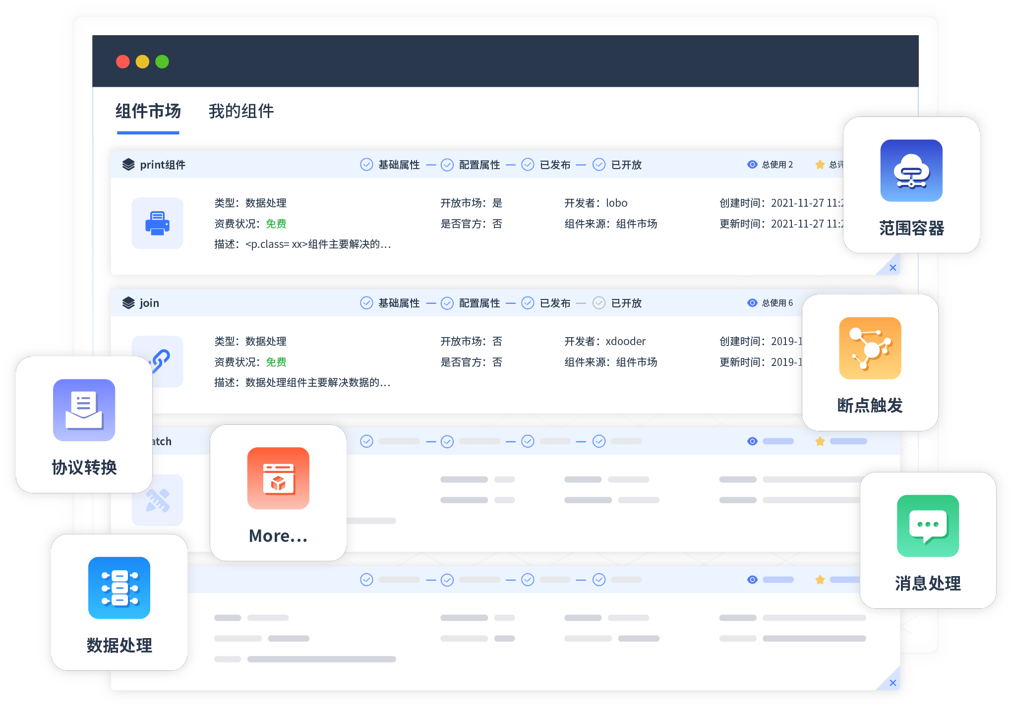 针对集成场景,南宫28在线登录提供组件市场,例如协议转换、消息处理、文件操作等。除平台提供的组件外,客户可以自定义所需组件。